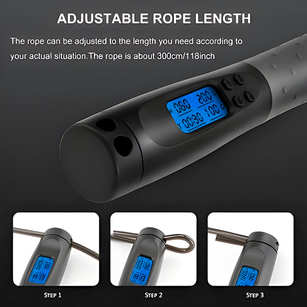 Ekraan näitab: kaloreid (kuni 999), hüppeid (kuni 9999), kaalu (20–120 kg), aega (1–60 minutit)