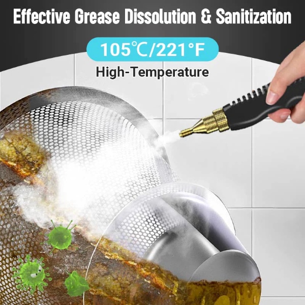 1600W nimivõimsus tekitab auru kuni 105℃ vähem kui 10 sekundiga, eemaldades kiiresti rasva, mustuse, tolmu ja plekid erinevatelt pindadelt.